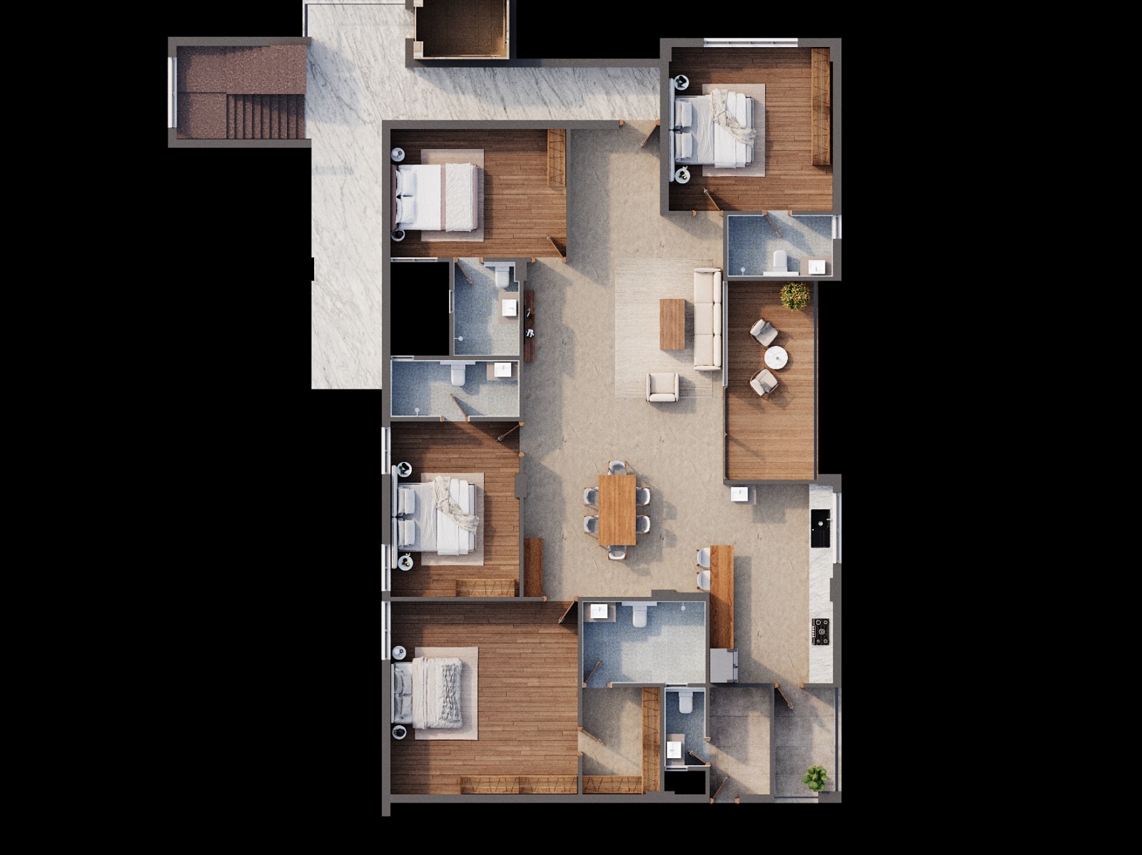Security rest room, utility & electrical rooms, common servant toilets.
